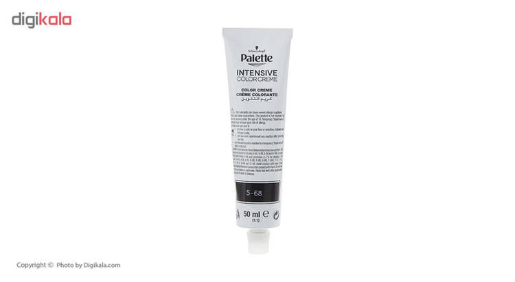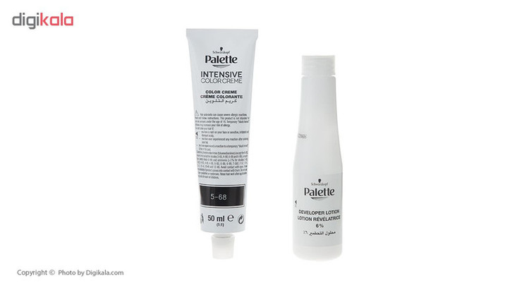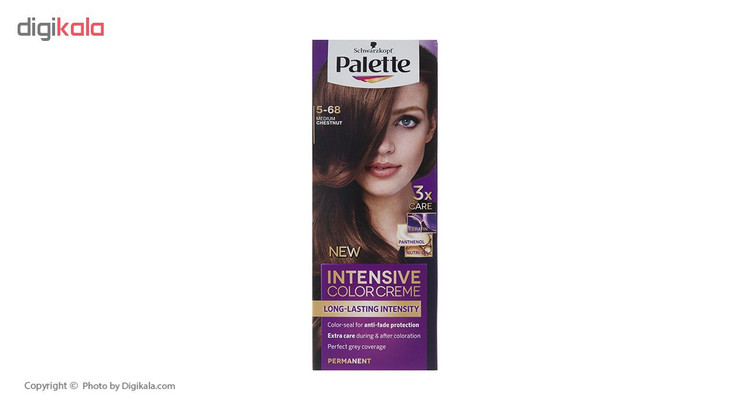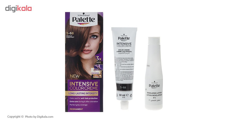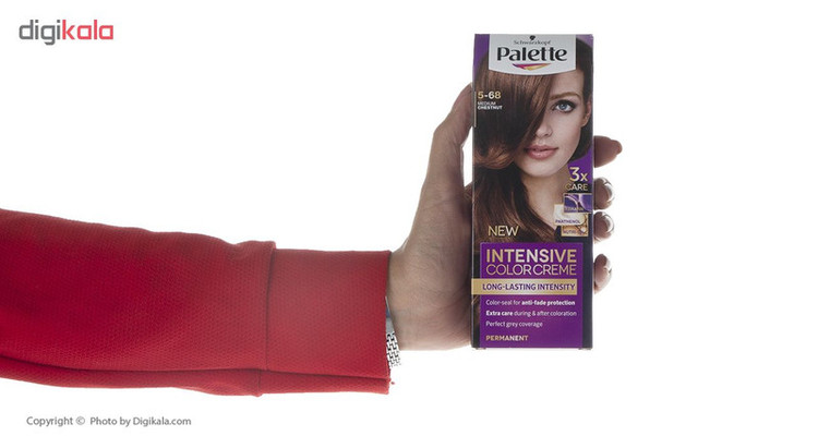 کیت رنگ موی زنانهی برند «پلت» (Palette) حاوی مواد و لوازم موردنیاز رنگکردن موها است. درون کیت رنگ پلت یک تیوب رنگ 50 میلیلیتری، یک اکسیدان شمارهی 2 یا همان 9 درصد، یک ماسک موی ده میلیلیتری و یک جفت دستکش پلاستیکی بیرنگ برای مراقبت از پوست دستها قرار داده شده است. ماسک موی موجود در کیت حاوی کراتین است که میتواند از موها دربرابر آسیبهای واردشده از رنگ مو مراقبت و محافظت کند. ماسک موی درون کیت پلت را باید از رنگکردن موها و هنگامی که موها خیس هستند استفاده کنید تا تاثیر آن را بهخوبی روی موها مشاهده کنید. اکسیدان 50 میلیلیتری پلت اکسیدانی تقریباً قوی محسوب میشود و با استفاده از آن میتوانید رنگ موی دلخواهتان را داشته باشید. کیت رنگ موی پلت دارای شماره مجوز از سازمان غذا و دارو است و از نظر بهداشتی کاملاً تاییدشده و مطمئن محسوب میشود. شمارهی 5-68 از سری «Intensive» مدل «Medium Chestnut» رنگی فندقی و قهوهای دارد که موهایتان را براق و خوشایند میکند و رنگی زیبا و متفاوت به موهایتان میدهد. اگر موهایی کوتاه دارید یک تیوب از رنگ موی پلت برای شما کافی است اما اگر موهایی با حجم بالا و بلند دارید بهتر است از چند تیوب استفاده کنید تا کل موهایتان را پوشش دهد. بهتر است بدانید آب بسیار داغ، شامپوهایی بهغیراز شامپوهای مخصوص موهای رنگشده و آفتاب از عواملی هستند که رنگ موها را زودتر ازبین میبرند و از تثبیت و ماندگاری طولانیمدت رنگ مو جلوگیری میکنند.